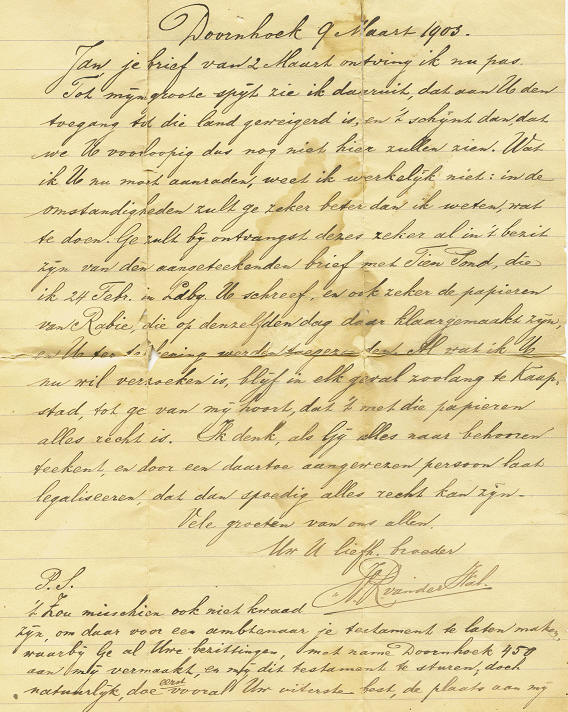 Een van die briewe wat Willem aan Jan geskryf het terwyl Jan in Kaapstad gewag het om die land weer binne te kom na hulle vrylating as krygsgevangenesse.