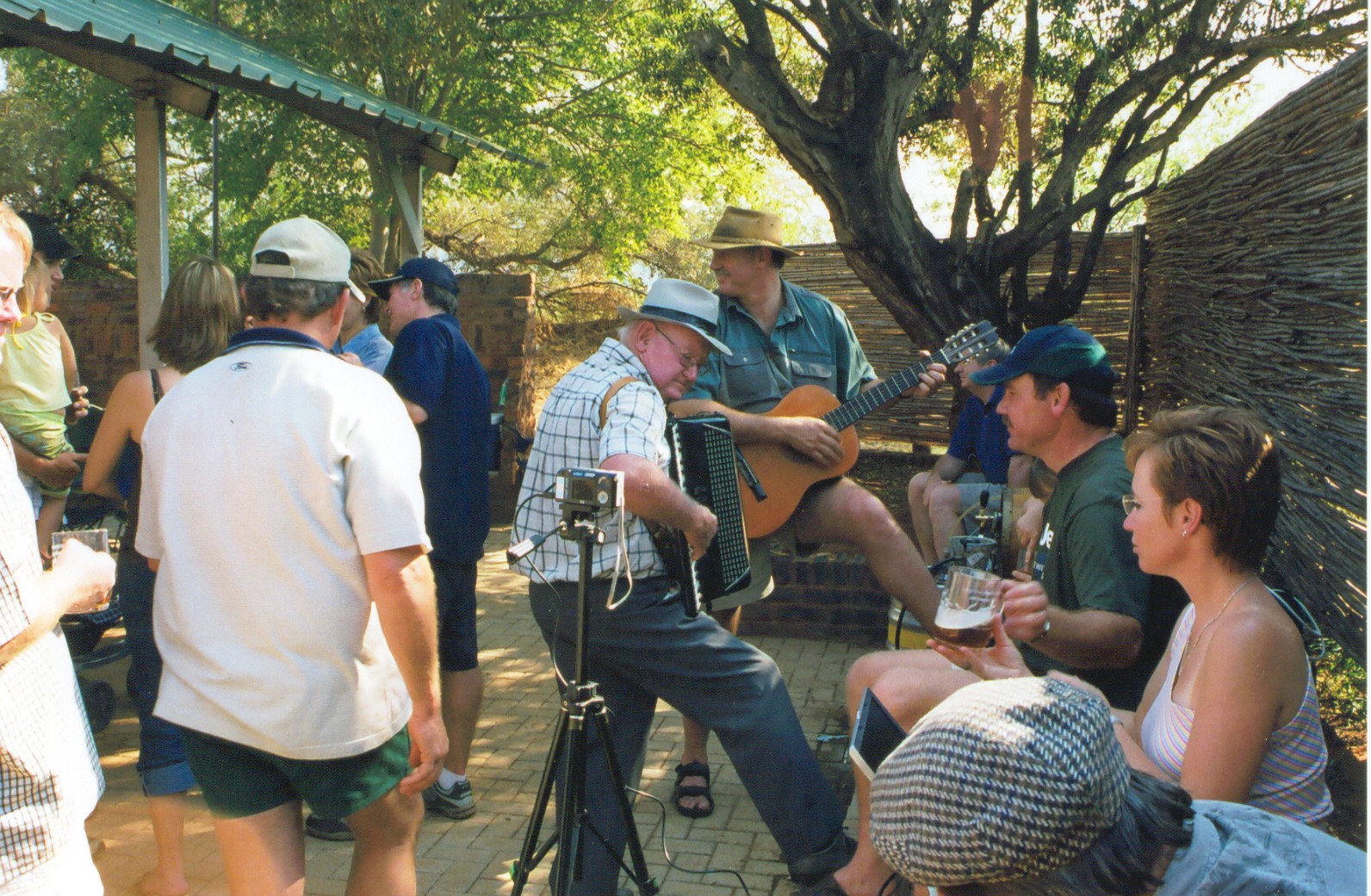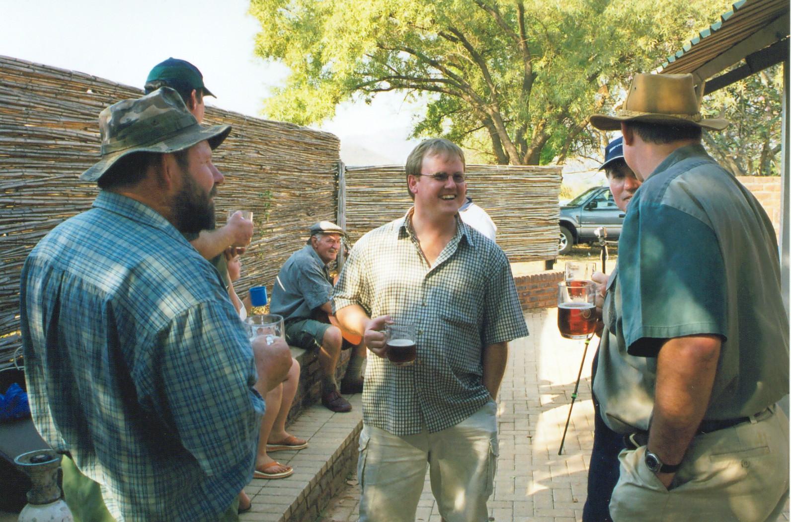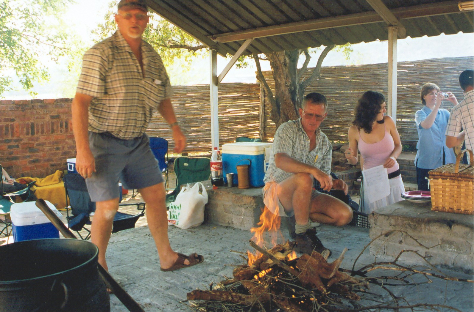 Almal in 'n gesellige luim onder die afdak langs die vure |